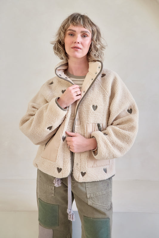 O&F Heart Embroidered Borg Fleece Jacket - Dark Oat