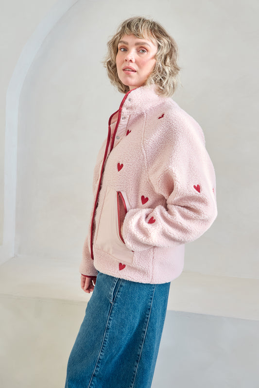 O&F Heart Embroidered Borg Fleece Jacket - Dusty Pink