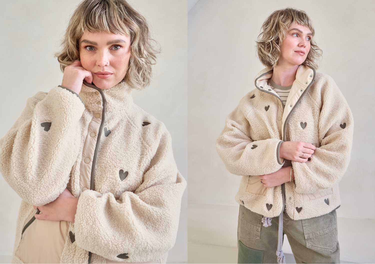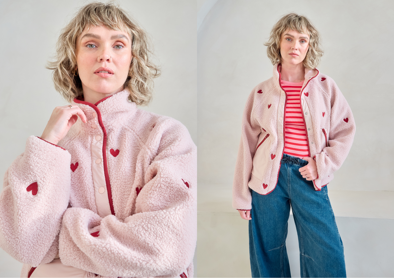 The heart embroidered fleece jacket is a cosy essential designed for effortless layering and everyday warmth. Made from soft borg fleece and fully lined for added comfort this jacket features a classic front popper fastening and two zip-close pockets.