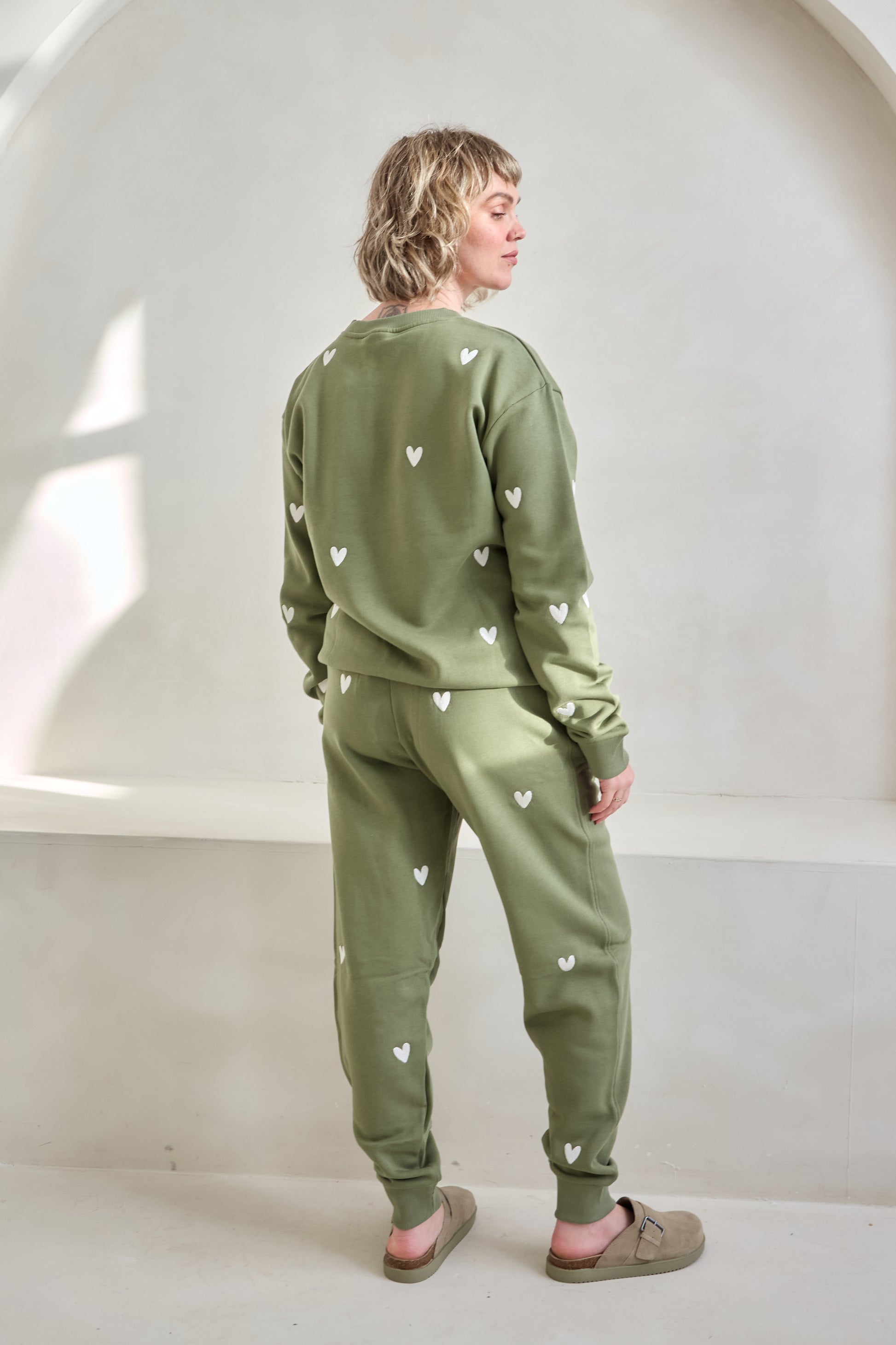Super comfy joggers featuring little embroidered hearts across the front and back. A slim fit with pockets, drawstring tie waist and tapered elasticated cuff at the ankle. Perfect for lounging but work equally well as an alternative to jeans.