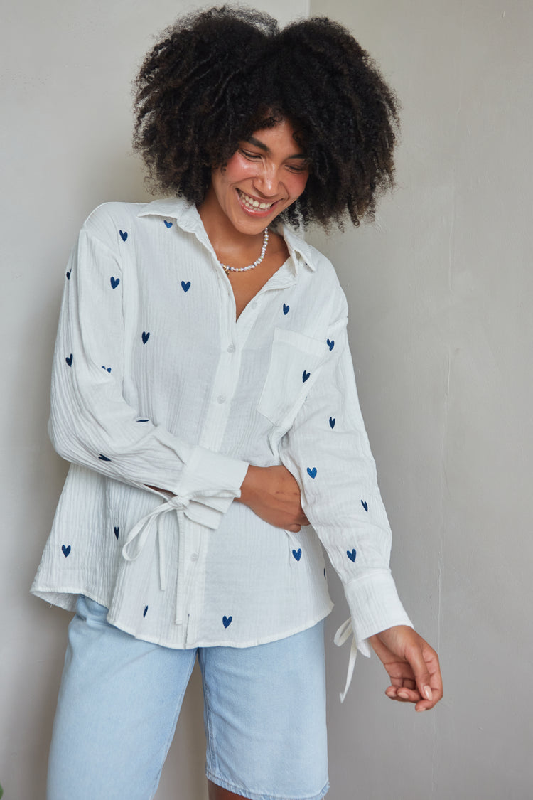 Our heart embroidered shirt is a timeless classic. Made from lightweight muslin cotton, it offers a soft, breathable feel that drapes beautifully for all day comfort.