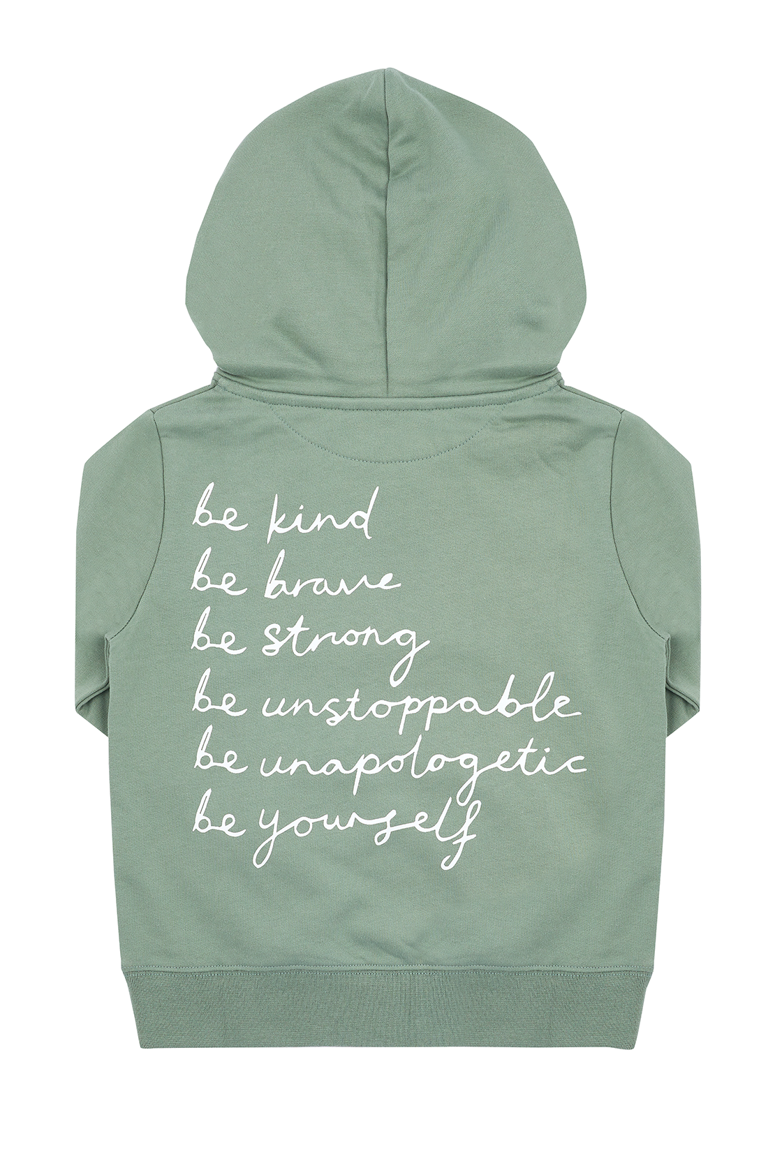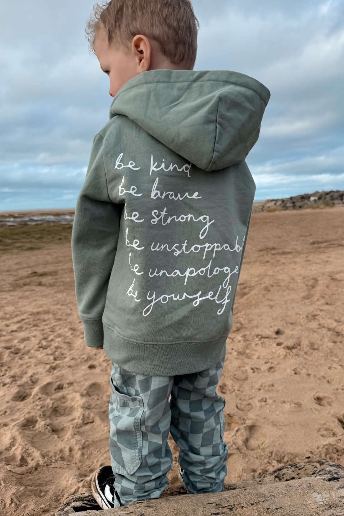 This hoodie carries a powerful message "Be kind, be brave, be strong, be unstoppable, be unapologetic, be yourself" designed to remind every child to embrace their unique self and conquer the world with confidence!