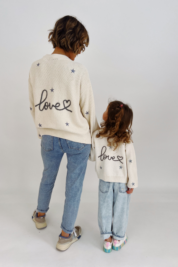 Introducing the Mini Love Cardigan, our much loved cardigan is now available for kids. Each piece is meticulously knitted to the highest standard and finished with delicate embroidered detailing, ensuring both style and comfort for your little one.