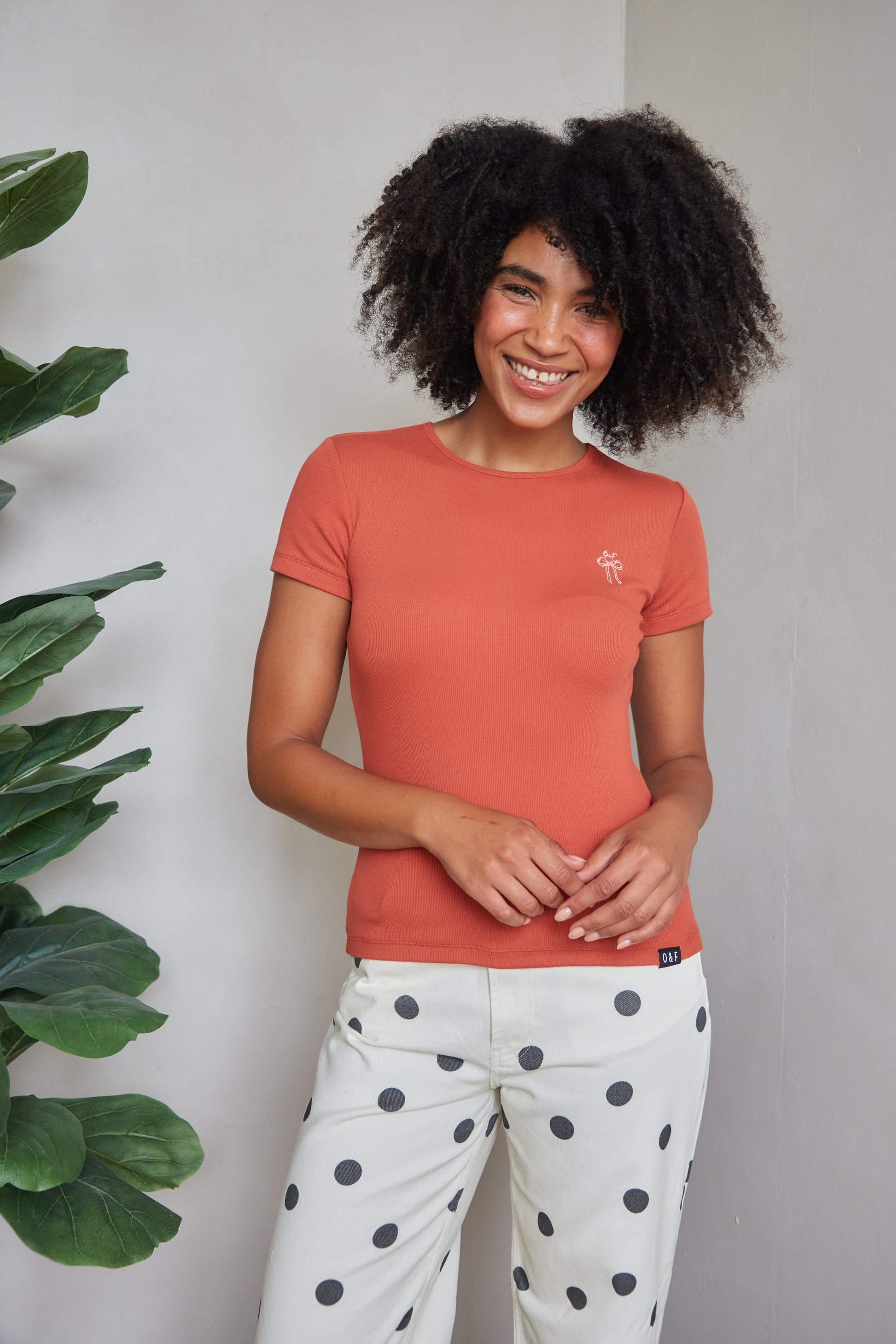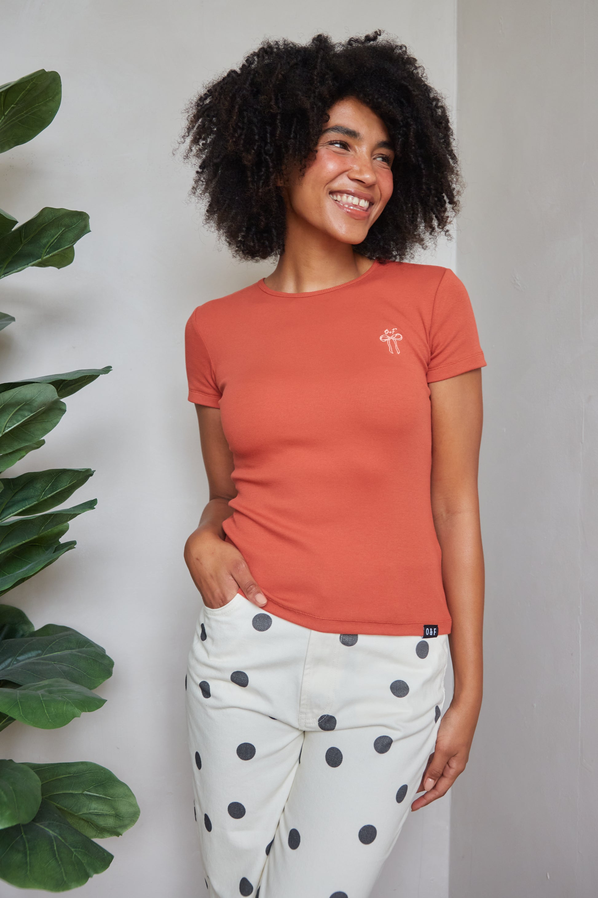 Our rib tee is a timeless everyday essential. Made from 100% soft cotton it's comfortable with a snug-yet-stretchy fit. The rich rust tone makes it a versatile piece for all seasons, while the delicate bow embroidery add a subtle, unique twist.