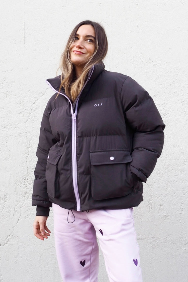 This gorgeous puffer jacket is just what you need for those chilly days. It features a contrasting chunky lilac zip, two front pockets with a popper fastening and an extra hidden pocket with a side opening for convenience. The perfect addition to your winter wardrobe, this jacket is soft, comfortable and warm!