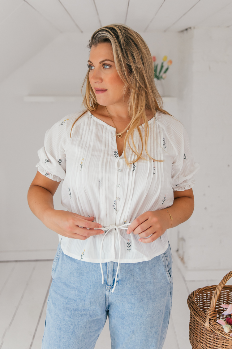 The Gaby blouse is crafted from 100% cotton and features pretty floral embroidery across the front and back. With blouson sleeves, elegant pleats and a tie at the waist that allows the blouse to be worn loose or more form fitting.