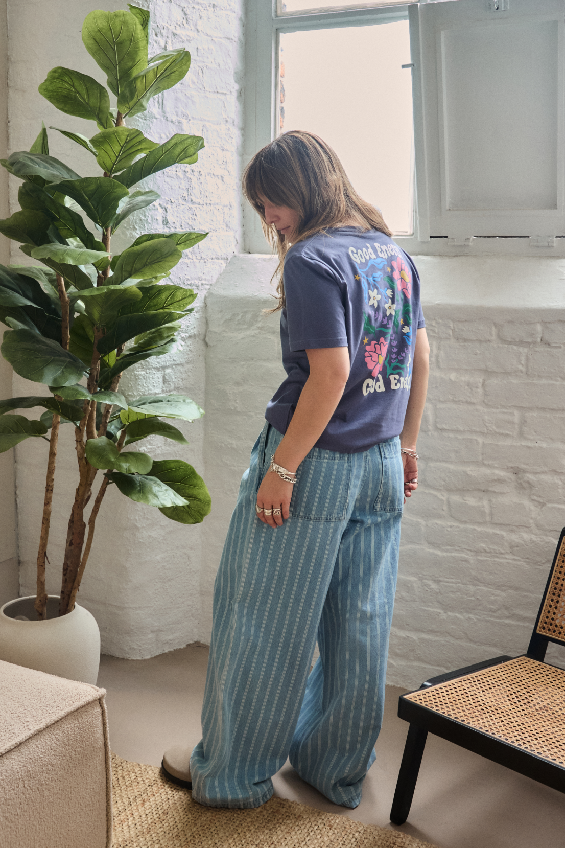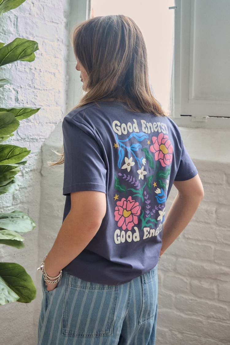 This soft cotton tee features an embroidered smiley on the front and illustrated “Good Energy” back print, a reminder to radiate positivity wherever you go.