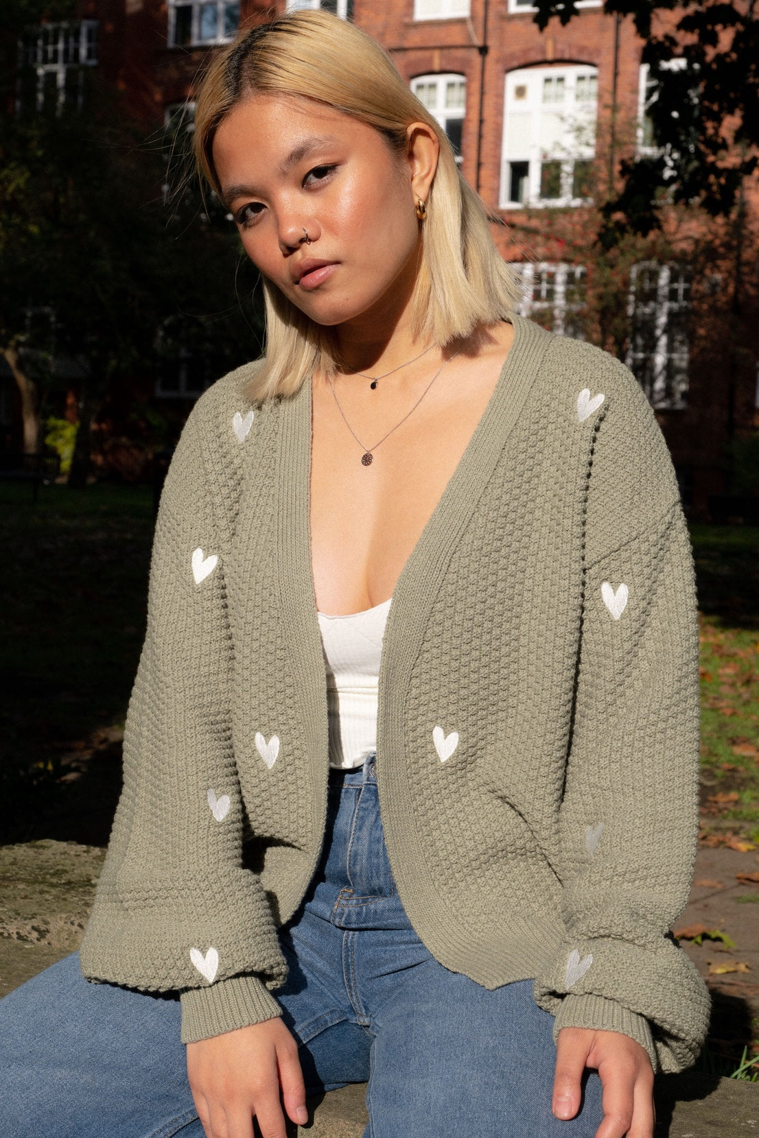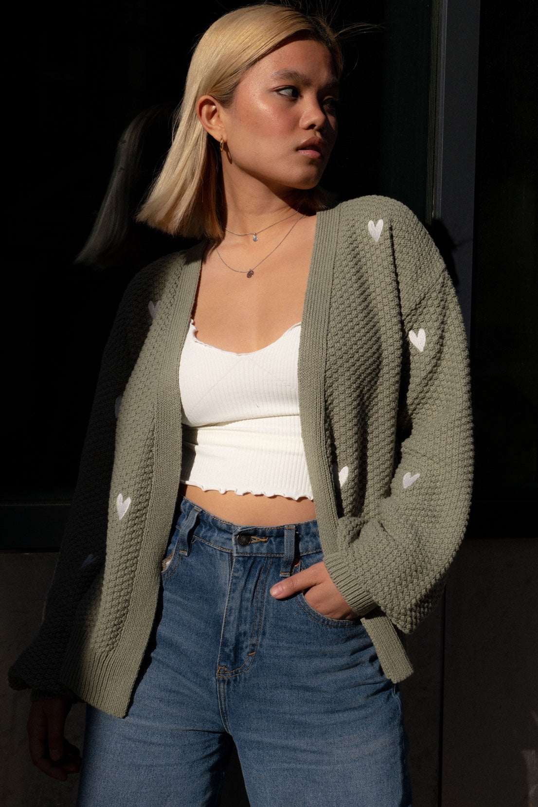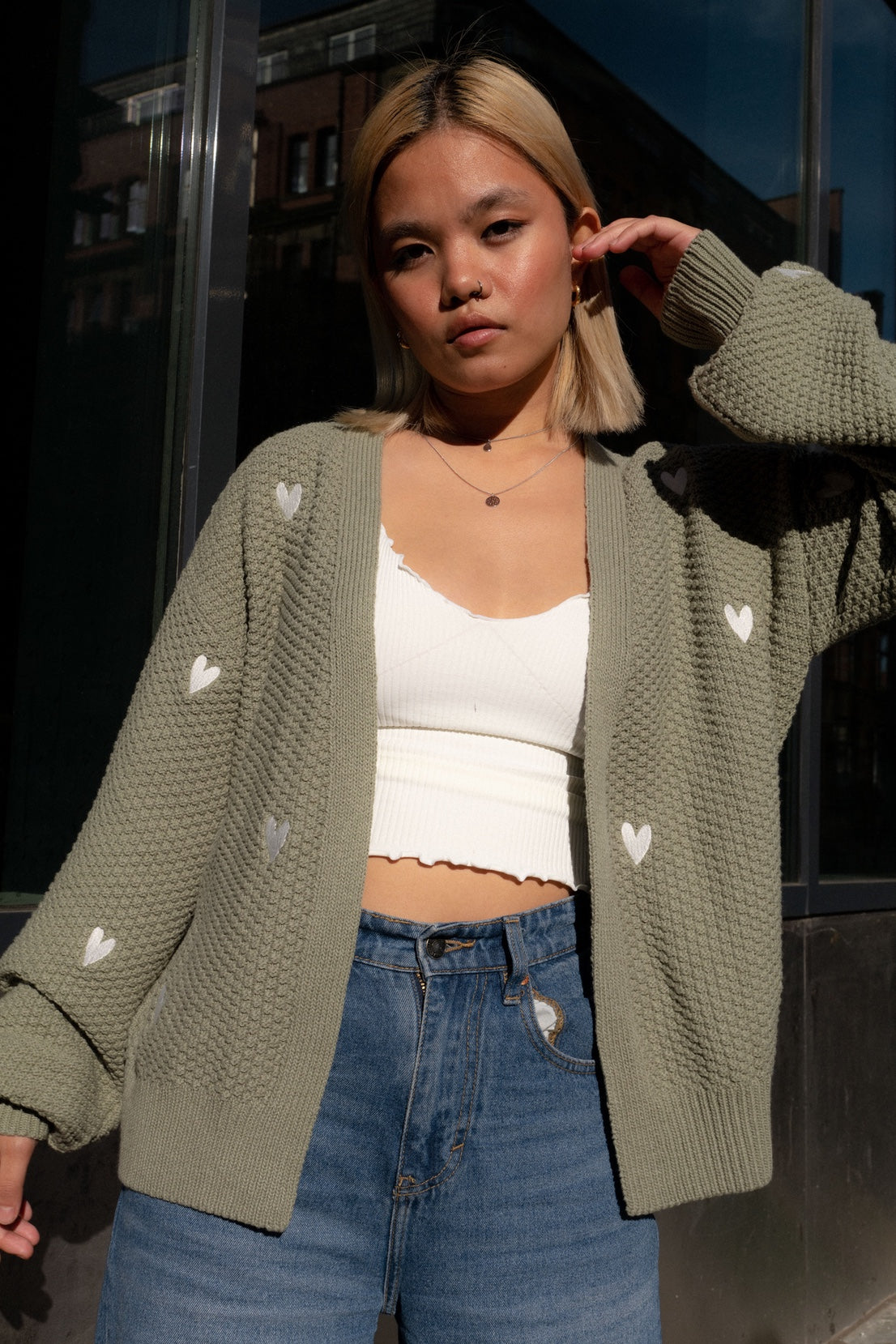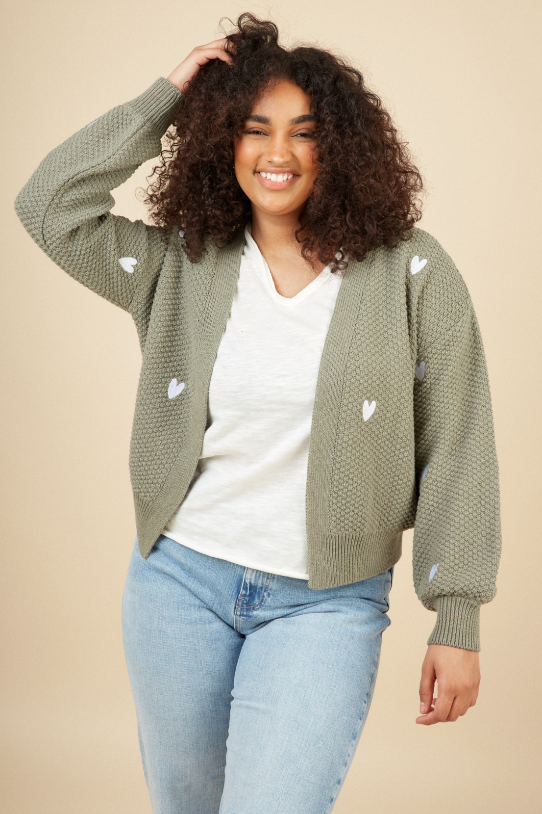 O&F Heart Embroidered Cardigan - Sage