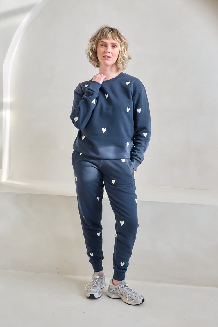 Super comfy joggers featuring little embroidered hearts across the front and back. A slim fit with pockets, drawstring tie waist and tapered elasticated cuff at the ankle. Perfect for lounging but work equally well as an alternative to jeans.