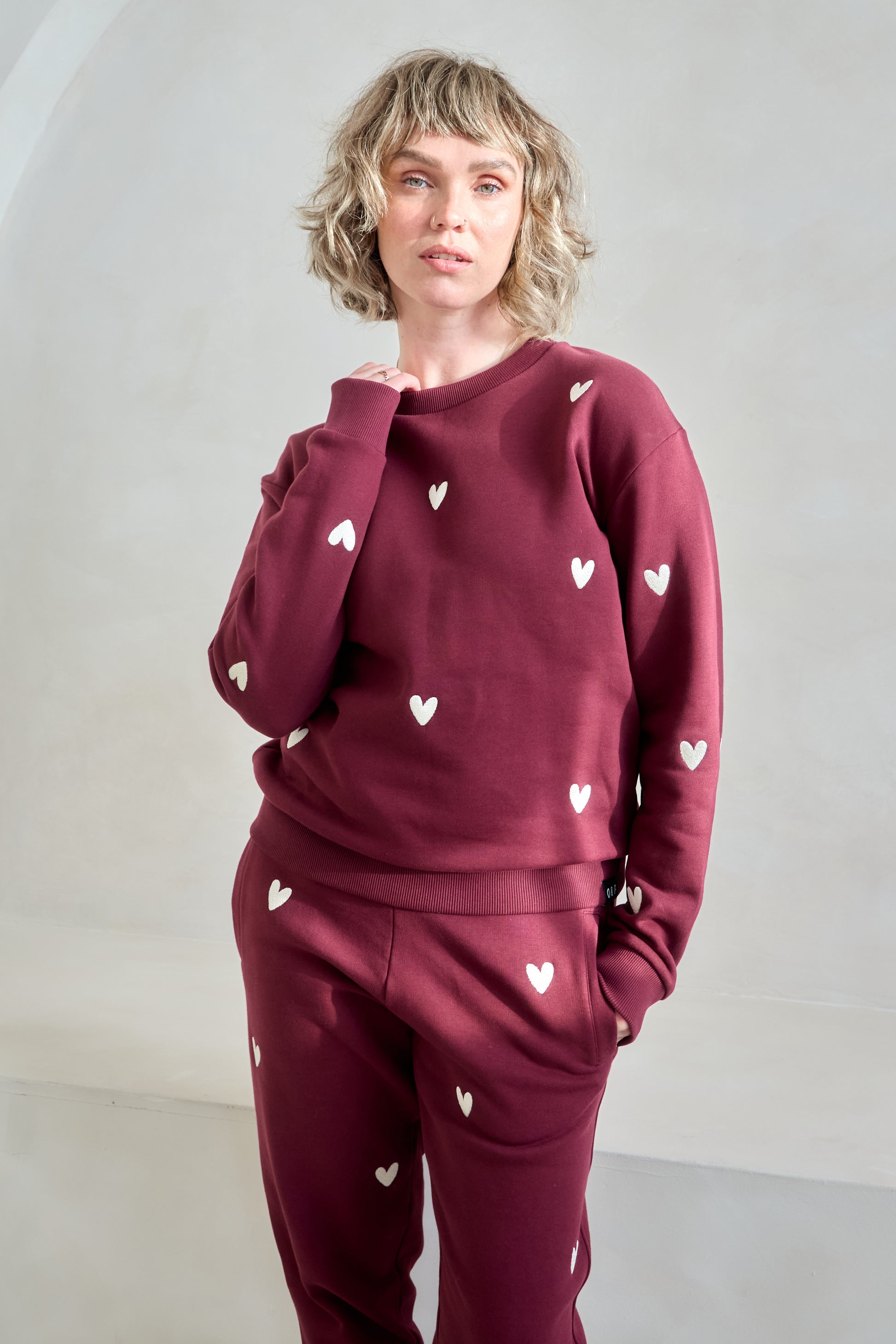 Burgundy cotton sweatshirt featuring little embroidered hearts across the front, back and sleeves. Super soft and fleece lined it's the perfect sweatshirt to keep you cosy! Pair with matching joggers for the full tracksuit look.