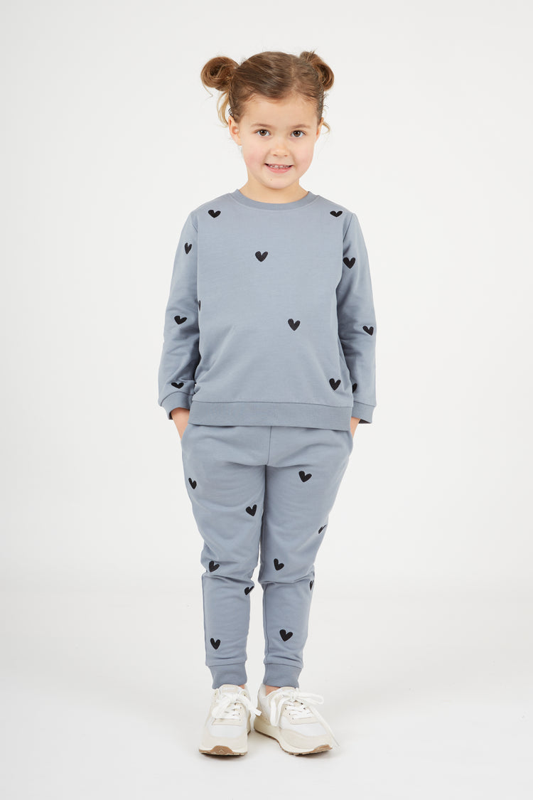 Colour: Blue/grey sweatshirt with black embroidered hearts