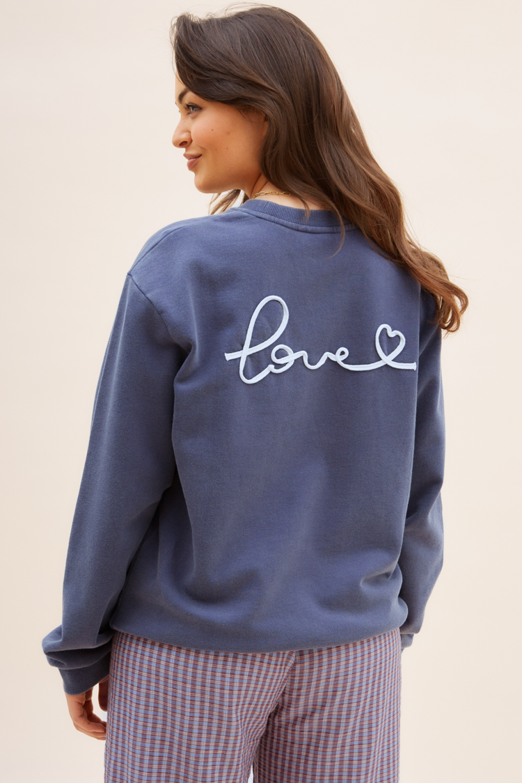 The 'LOVE' sweatshirt is made from ultra-soft, washed navy fabric. It features an embroidered smiley face on the front and 'LOVE' appliqué across the back, making it a perfect blend of style, comfort, and positivity.