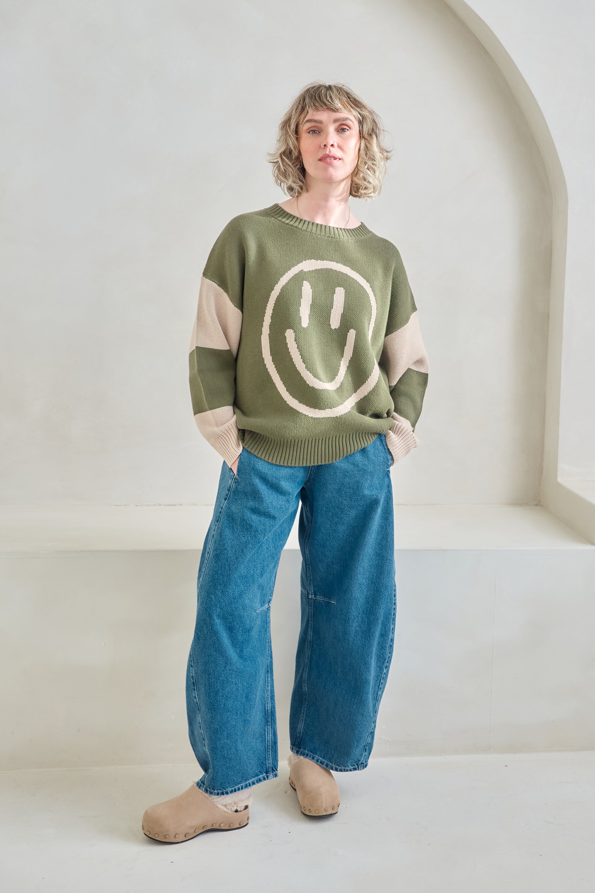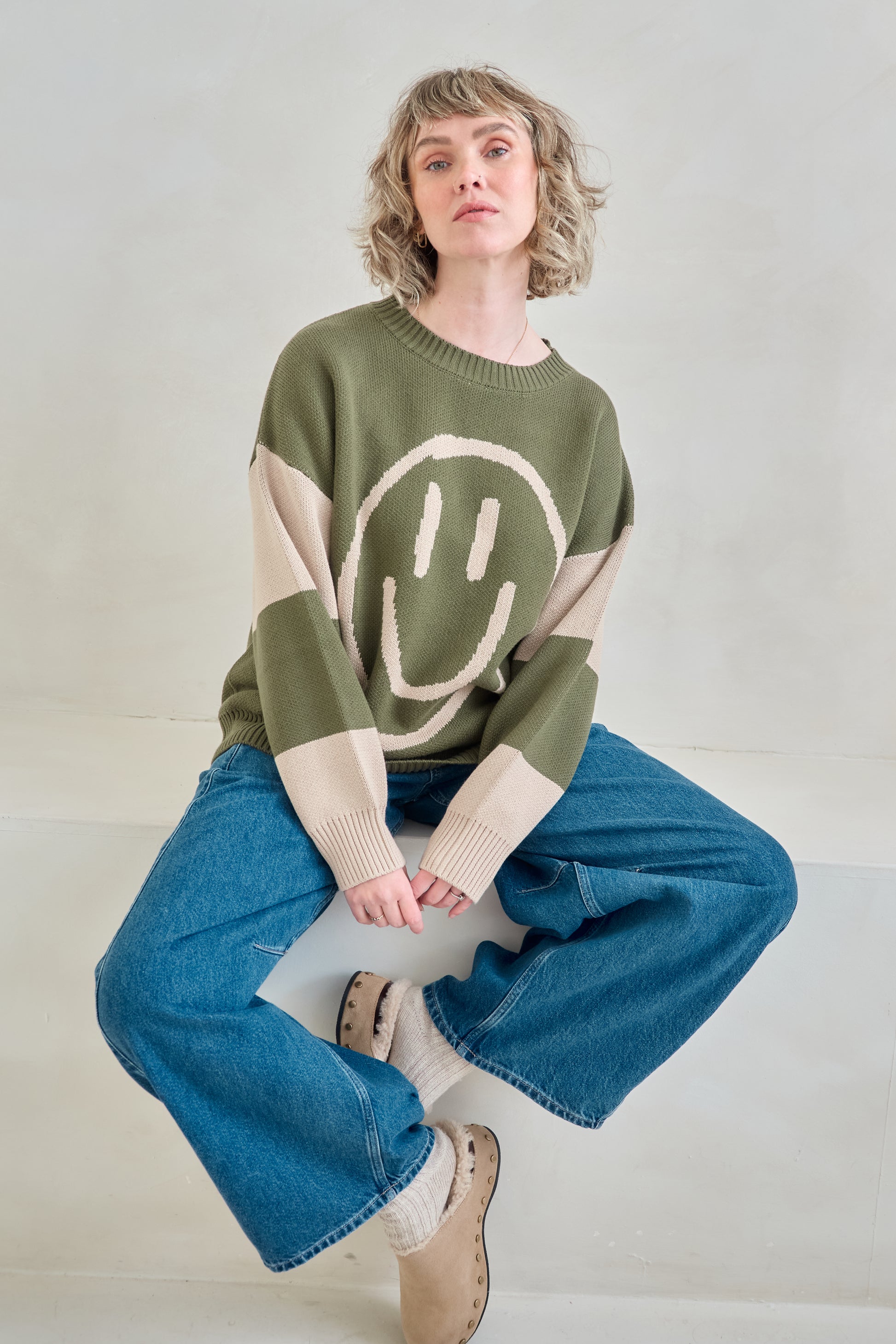 A perfect blend of comfort and style, this jumper is designed for effortless everyday wear. It features a smiley face across the front and unique block stripes down the sleeves.